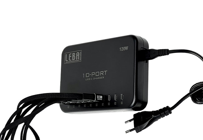 Der 10-Port Multi-Charger USB-C lädt bis zu 10 Geräte gleichzeitig mit 12W pro Anschluss und ist in den Leistungsvarianten 120W und 200W verfügbar. Ideal für iOS-, Android- und Windows-Geräte in projektspezifischen Anwendungen.