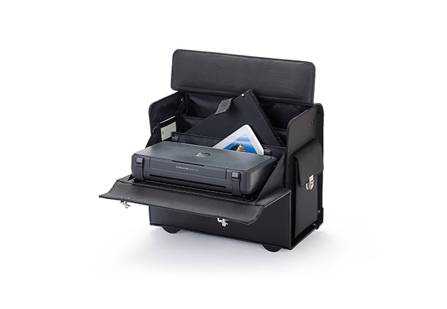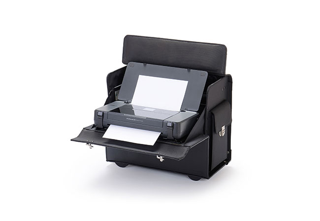 Die komplette Verkabelung verläuft fast unsichtbar im Innern des Koffers. Sämtliche Geräte werden mit einem einzigen Kabel über einen Durchlass in der linken Seitentasche mit Strom versorgt. Zum Arbeiten nehmen Sie Ihr Notebook ganz einfach heraus. Auf der Vorderklappe wird der Drucker befestigt, am besten mit der optional erhältlichen Druckerhalterung "QuickFix". Damit die Druckerklappe beim Öffnen des Koffers nicht nach unten aufklappt, wird diese mit zwei seitlich angebrachten Druckknöpfen fixiert. Diese lassen sich bei Gebrauch ganz einfach lösen, so dass die Druckerklappe in Position gebracht werden kann. Das integrierte Trolley-System sorgt für einen besonders bequemen Transport Ihres Mobilen Büros. Der mitgelieferte abnehmbare Schultertragegurt kann als alternative Transportlösung verwendet werden. *Sämtliche abgebildeten Geräte (wie Notebook, Drucker etc.) sind nicht im Preis und Lieferumfang enthalten!