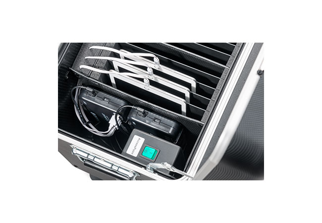 Alle im Koffer vorhandenen Tablets lassen sich im geschlossenen Koffer über die zentrale Stromversorgung aufladen.